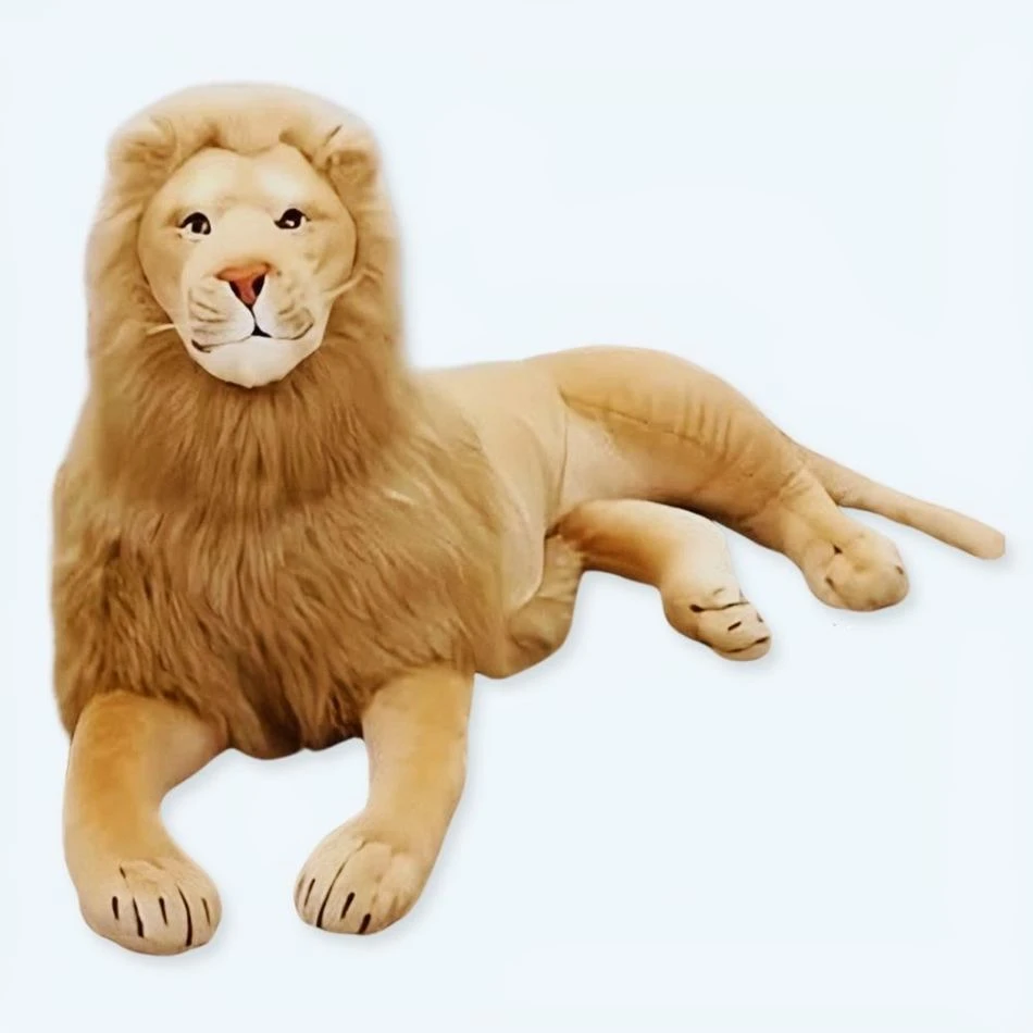 Coucou câest moi, le lion ! Je suis en peluche et je suis trĂšs doux. Jâai une belle fourrure marron et je mesure environ 82 cm de haut. Je suis trĂšs cĂąlin et jâadore quâon me gratte sous le menton. Je miaule doucement quand on me serre dans les bras. Je suis le roi de la jungle et je fais toujours ce que je veux !