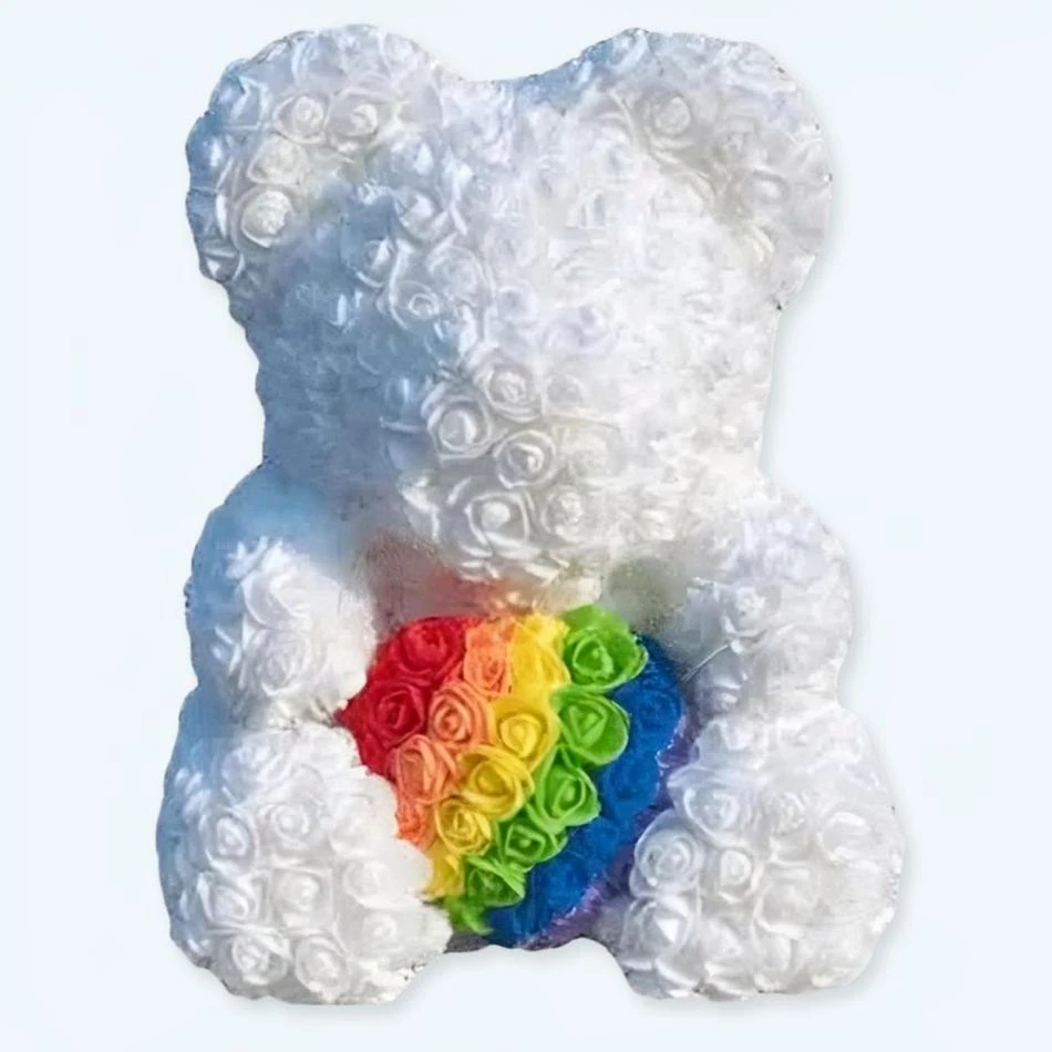 Elle a une fourrure blanche avec des rayures arc-en-ciel et des oreilles roses en satin. Ses yeux noirs brillants et son expression amicale rendront n’importe quelle personne heureuse. Cet ours en peluche est rembourré de roses de haute qualité pour un maximum de confort et de douceur.