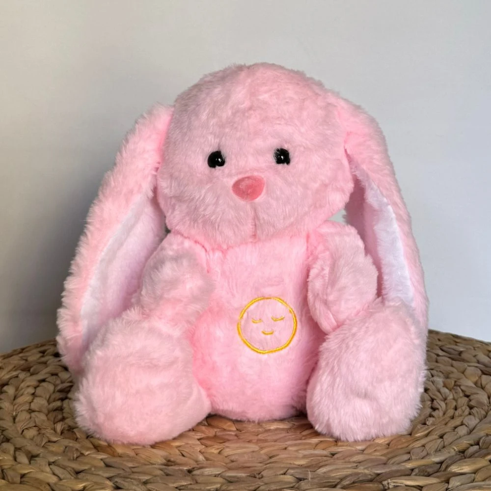 Découvrez cette adorable peluche veilleuse en forme de lapin rose, douce et réconfortante. Ce petit compagnon respire doucement, avec son ventre qui se soulève lentement, imitant une respiration apaisante et relaxante.